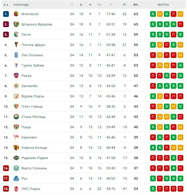 Столько же очок набрал и «Шленск», но уступил команде из Белостока по дополнительным показателям. Третье место заняла «Легия».