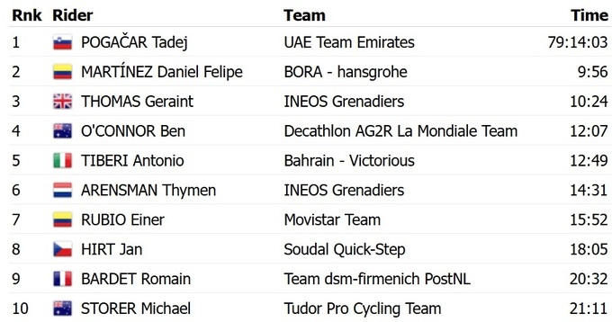 Помимо розовой майки за победу в общем зачете, Погачар также завоевал синюю майку лучшего горняка. В спринтерском зачете победил итальянец Джонатан Милан из «Lidl Trek», а лучшим молодым гонщиком стал Антонио Тибери из «Bahrain Voctorious», который в общем зачете замкнул топ-5.