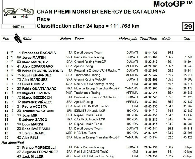 Действующий чемпион мира Франческо Баньяйя выиграл Гран-при Каталонии на трассе в испанской Барселоне. Лидер Дукати начал гонку со второго места и выиграл старт. Вскоре он проиграл лидерство Хорхе Мартину из Pramac, но за шесть кругов до финиша смог его вернуть и довести гонку до победы. Мартин финишировал вторым.