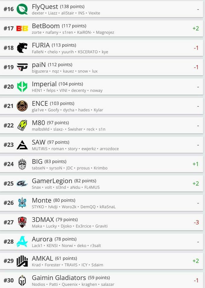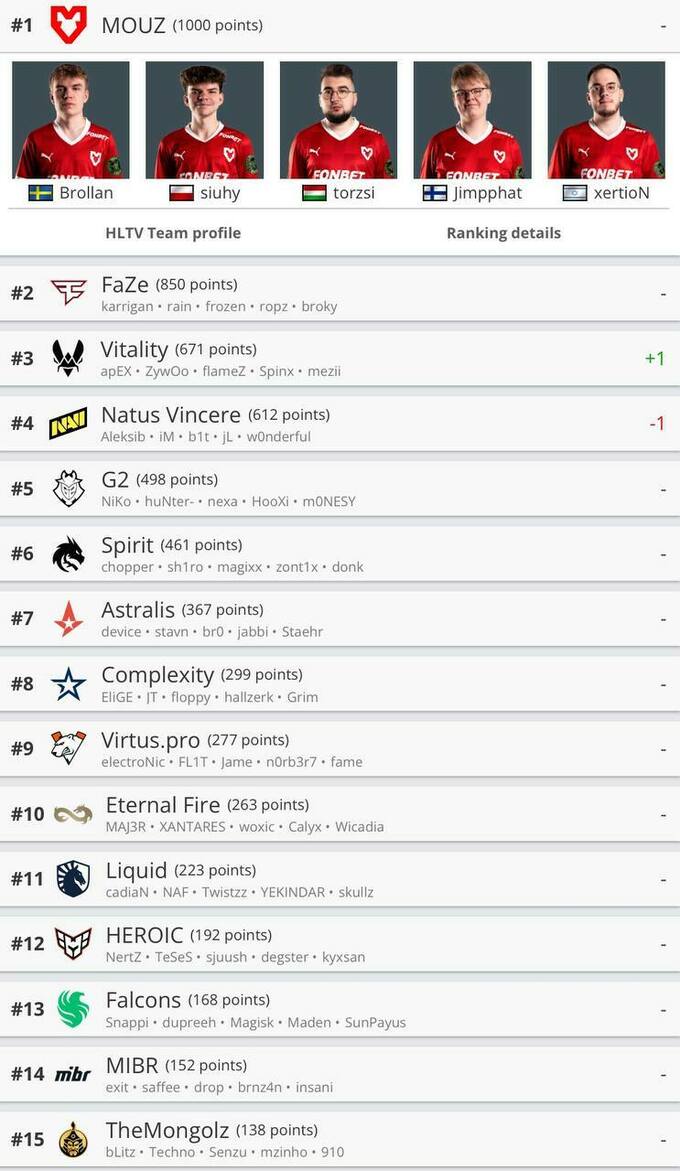 Первые две позиции остались без изменений: MOUZ лидирует, FaZe Clan – второе место. Natus Vincere вылетели из топ-3, их подвинула французская организация Team Vitality.