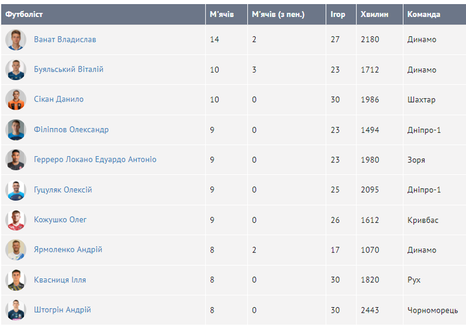 Нападающий «Динамо» Владислав Ванат стал лучшим в рейтинге, забив 14 голов и совершив 10 ассистов (24 результативных действия).