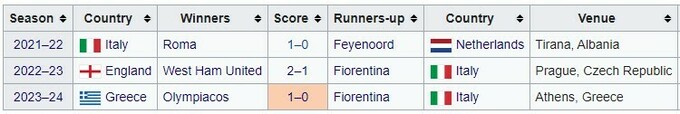 Лига конференций имеет три различных обладателя за три года существования турнира: Рома (Италия), Вест Хэм (Англия) и Олимпиакос (Греция).