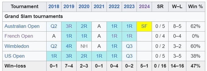 Ранее выигранных 7 матчей на турнирах Grand Slam у нее было в 2019 году. Тогда она выиграла по две встречи на Australian Open и US Open, а также дошла до четвертого раунда на Уимблдоне.
