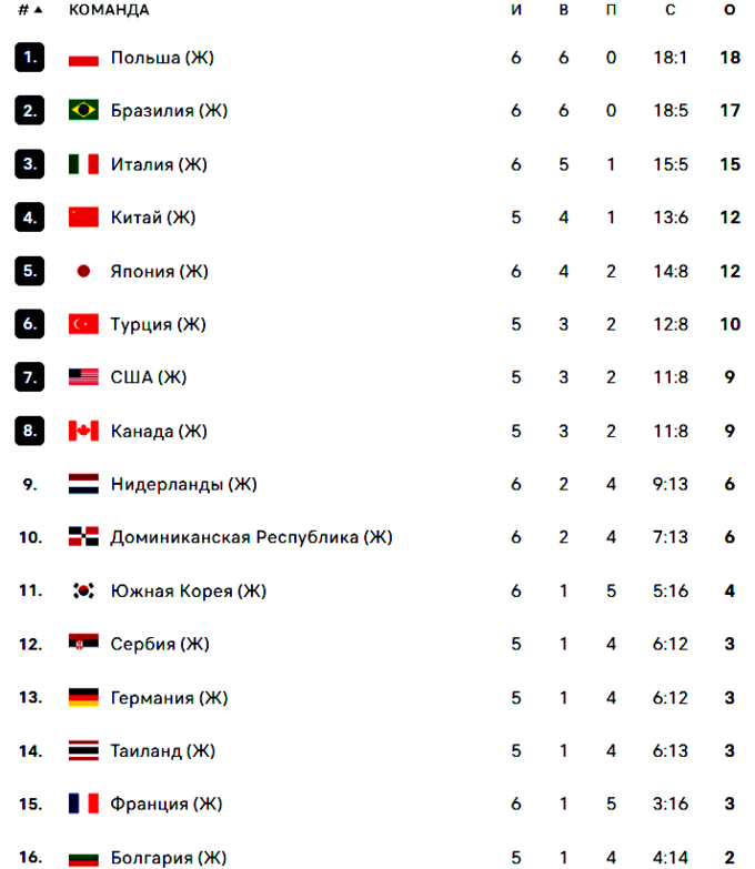 Отлично выступают пока сборные Польши и Бразилии, которые не проиграли ни одного поединка, при этом европейские волейболистки набрали максимальное количество очков, 18. Накануне польская команда нанесла поражение Сербии 3:1, а сегодня без особых проблем расправилась с соперницами из Южной Кореи 3:0.