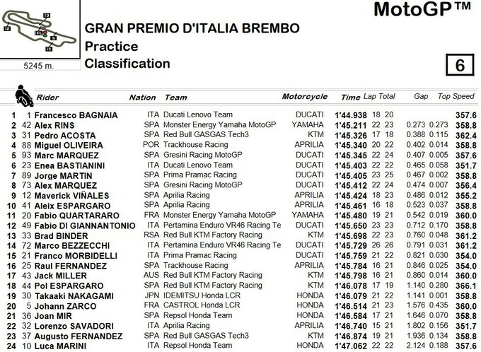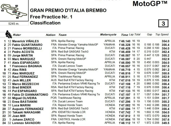 Первую сессию выиграл Маверик Виньялес из Априлии. Вместе с ним в первую тройку неожиданно вошли райдеры, которые в этом сезоне были в тени – лидер Ямаха Фабио Куартараро и второй номер Pramac Франко Морбиделли.