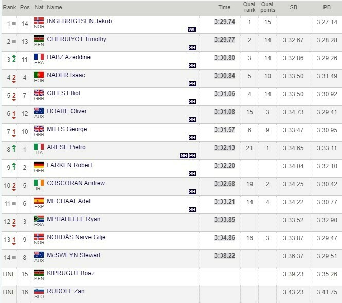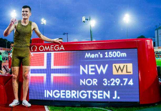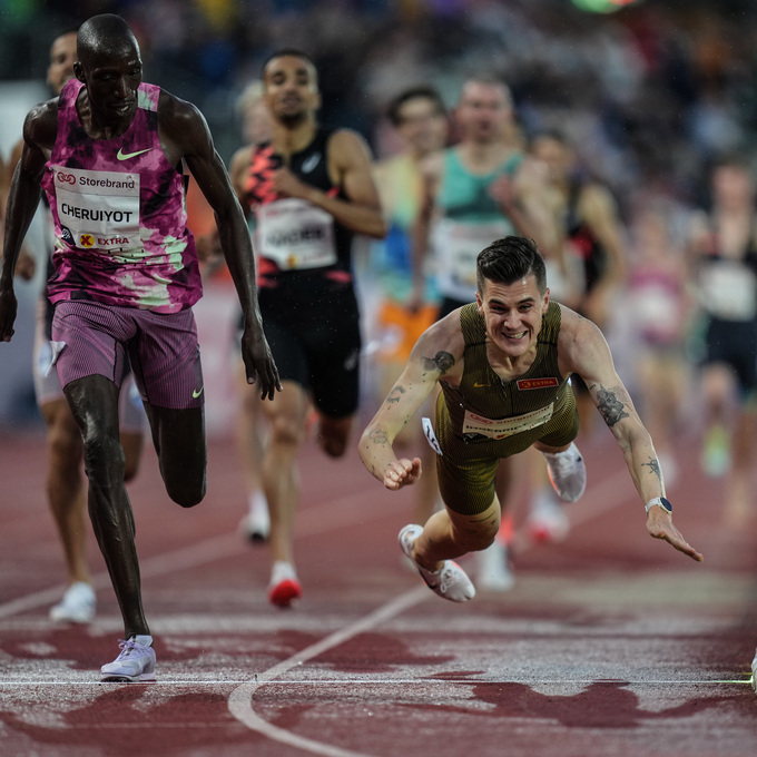 На домашней арене норвежец пробежал дистанцию 1500 м за 3:29.74, опередив на три сотых соперника – Тимоти Черуйота из Кении (3:29.77).