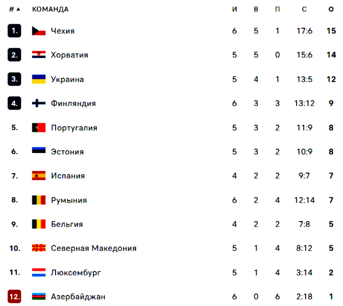 На последнюю четвертую путевку претендуют пять команд. Пока 9 очков у Финляндии, но она уже провела все 6 матчей, по 8 очков после 5 поединков у Португалии и Эстонии, 7 очков после 4 матчей у Испании и 5 очков у Бельгии после 4 поединков.