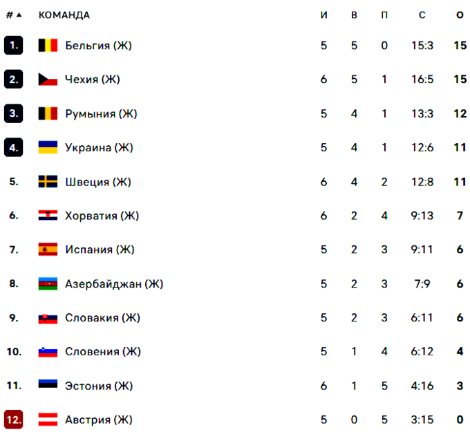 Теперь что касается женского турнира. Здесь сборные Бельгии, Чехии и Румынии уже вышли в финальный этап.