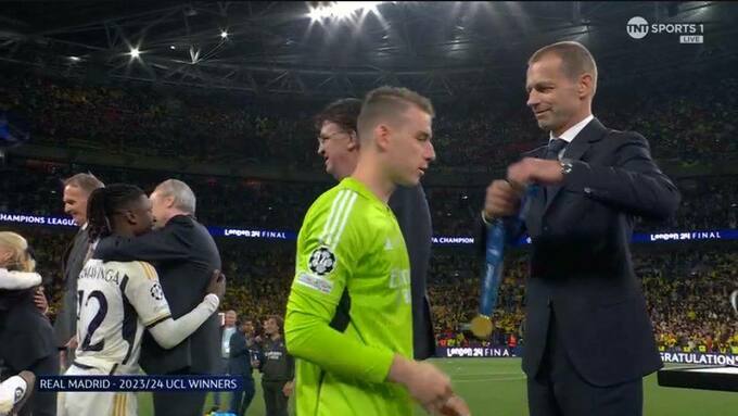 ФОТО. Чеферин наградил Лунина золотой медалью Лиги чемпионов 2023/24
