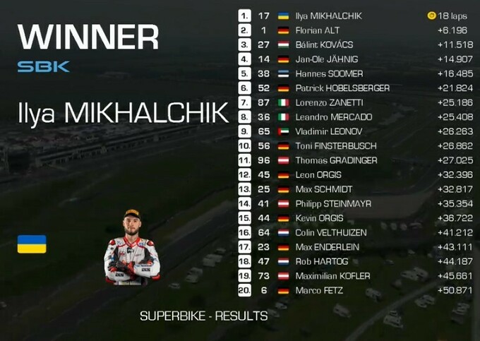 Михальчик начал гонку с поула, выиграл старт, лидировал до самого финиша и опередил Флориана Альта на Хонде, который занял второе место, более, чем на шесть секунд. Третьим финишировал один из партнеров украинца по команде Балинт Ковач.