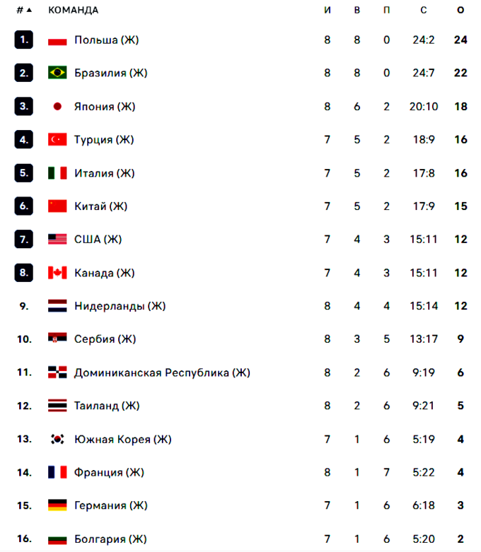 На третьем месте пока расположилась команда Японии, но сегодня немного позже ее может подвинуть победитель матча Италия – Китай.