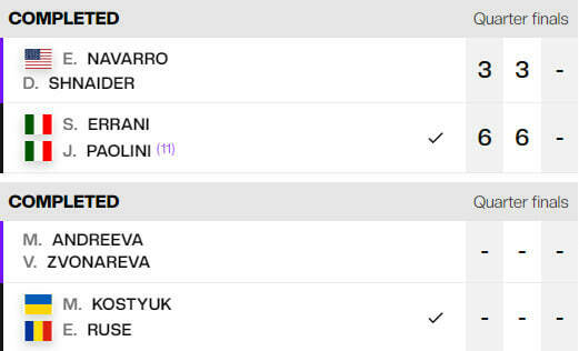 В полуфинале Костюк и Русе сыграют против итальянок Жасмин Паолини и Сарры Эррани. Интересно, что Паолини также выступит в 1/2 финала одиночного разряда, где как раз и сыграет с Андреевой.