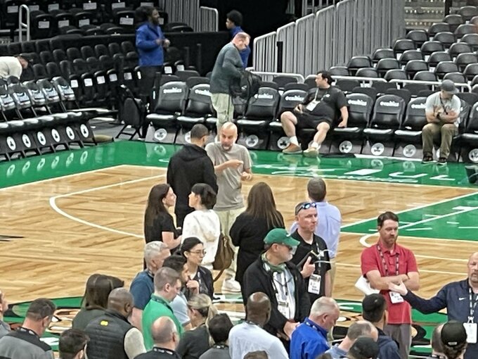 Испанский футбольный тренер Жузеп Гвардиола, возглавляющий «Манчестер Сити», и Джо Маззулла, руководящий баскетбольным клубов «Бостон», пообщались на паркете TD Garden – домашней арены «Селтикс».