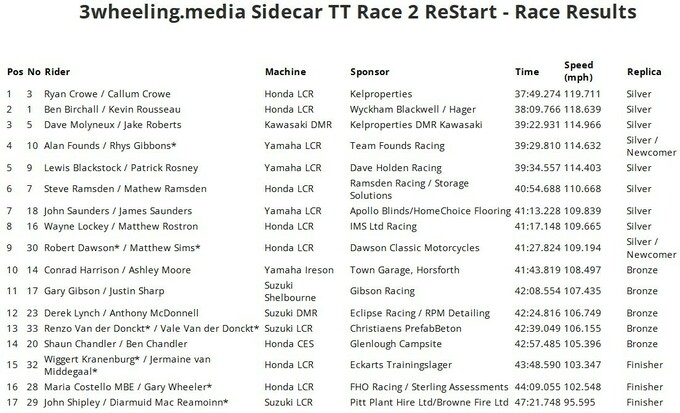 Первый круг после рестарта братья Кроу проехали со средней скоростью 119.092 мили в час и установили новый рекорд средней скорости для стартового круга. На втором круге экипаж с острова Мэн показал среднюю скорость 120.335 мили в час и стал вторым быстрейшим экипажем в истории гонок мотоциклов с колясками на Острове Мэн.