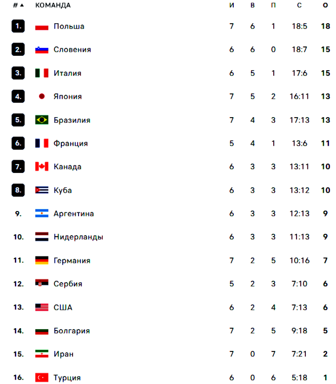 Одержав сегодня очередную победу, на этот раз над Японией 3:0, общую турнирную таблицу по-прежнему возглавляет сборная Польши. После 7 матчей у нее 18 очков при одном поражении.