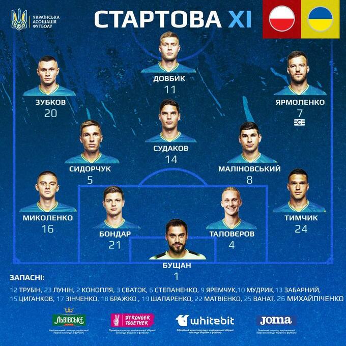 Украина: 1. Георгий Бущан, 16. Виталий Миколенко, 21. Валерий Бондарь, 4. Максим Таловеров, 24. Александр Тымчик, 5. Сергей Сидорчук, 8. Руслан Малиновский, 20. Александр Зубков, 7. Андрей Ярмоленко (к), 14. Георгий Судаков, 11. Артем Довбик.