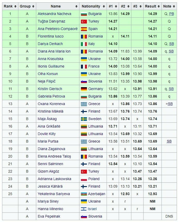 Квалификацию преодолели Ольга Корсун (13.99 м) и Анна Красуцкая (14.00 м). Для каждой из них это будет первый финал ЧЕ в карьере.