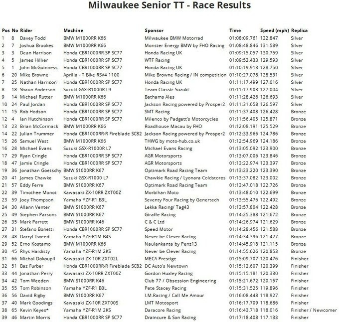 После схода Хикмена лидером стал Дэйви Тодд, который без проблем довел гонку до победы с отрывом в 39 секунд от Джоша Брукса, который занял второе место. Этот подиум стал для Брукса лучшим результатом в карьере на Isle of Man TT. Третьим стал Дин Харрисон.