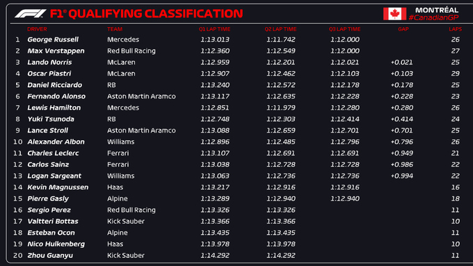 Состоялась квалификация в рамках гран-при Формулы-1 в Канаде. Поул завоевал пилот Мерседеса Джордж Расселл. При этом и Расселл, и Ферстаппен показали одинаковое время – 1:12,000. Но Расселл показал это время первым, поэтому выиграл свой второй поул в карьере. Невероятная квалификация.