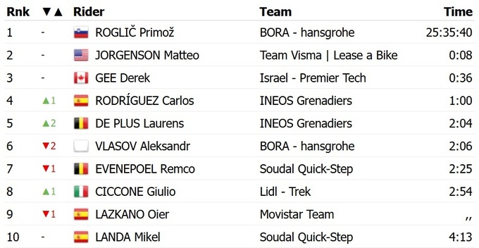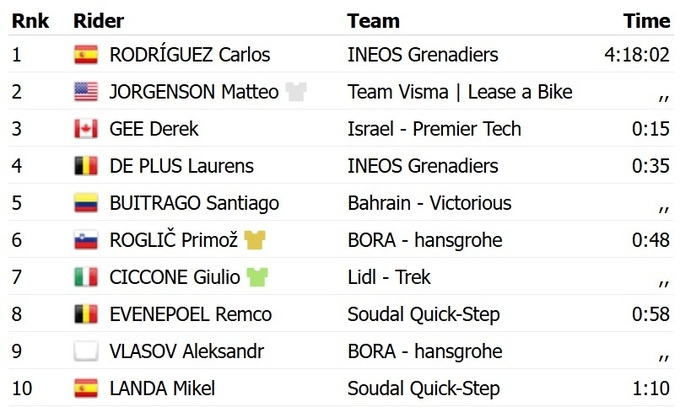 Победителем заключительного этапа стал испанец Карлос Родригес из «Ineos Grenadiers», который в общем зачете финишировал на четвертом месте.