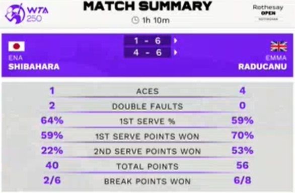 Чемпионка US Open 2021 Эмма Радукану (№209 WTA) обыграла в первом раунде травяного турнира WTA 250 в Ноттингеме Ену Сибахару (№274 WTA) и в следующем круге сыграет с украинкой Дарьей Снигур (№127 WTA).