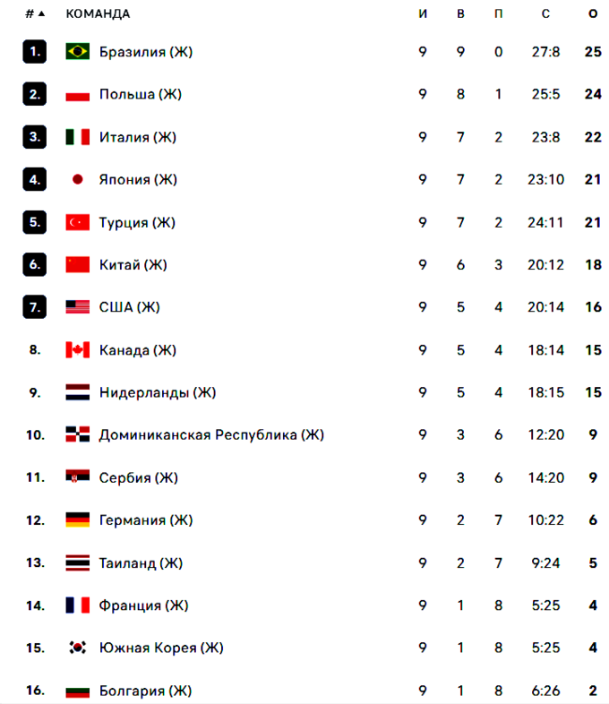 Первой обеспечила себе выход в четвертьфинал команда Бразилии. Сегодня южноамериканские волейболистки нанесли поражение теперь уже бывшему лидеру Лиги наций сборной Польши со счетом 3:1 и сами возглавили турнирную таблицу. Даже теоретически они не могут занять итоговое место ниже восьмого.