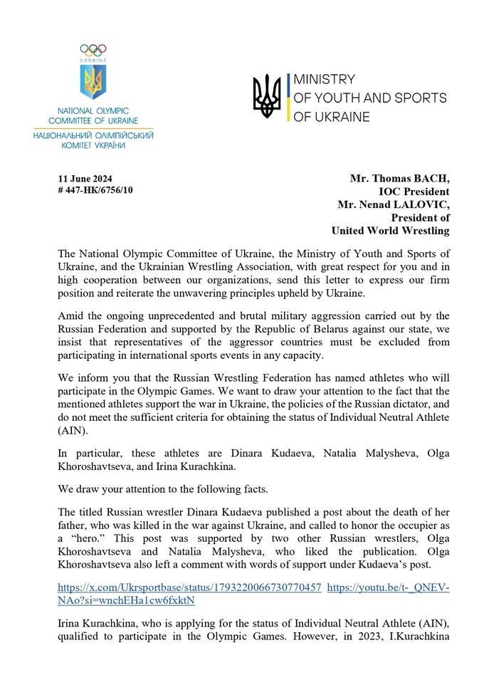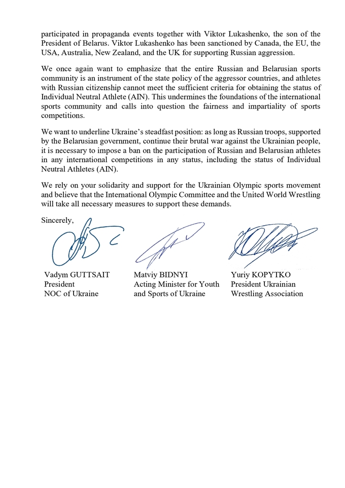 Президент Национального олимпийского комитета Украины Вадим Гутцайт, и. Министра молодежи и спорта Украины Матвей Бидный и президент Ассоциации спортивной борьбы Украины Юрий Копытко направили совместное письмо Международному олимпийскому комитету в связи с квалификацией на Париж-2024 представителей Российской Федерации и Беларуси, которые открыто поддерживают военные действия против Украины.