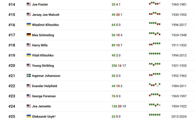 Действующий чемпион мира из Украины Александр Усик занимает в рейтинге пока 25 строчку.