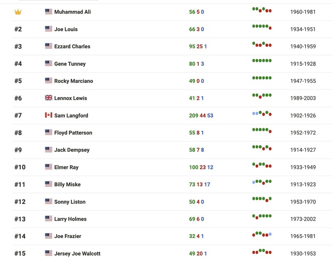 Компьютеризированная система портала BoxRec обнародовала свой рейтинг лучших хевивейтеров в истории бокса.
