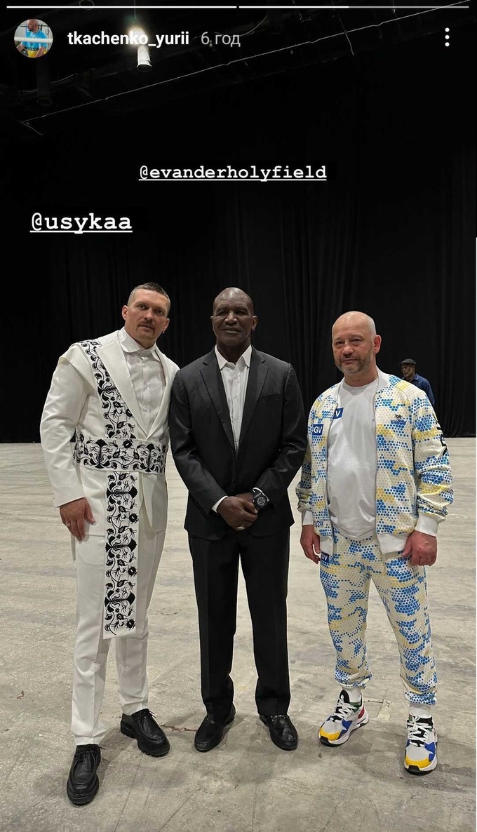 Абсолютный чемпион мира в супертяжелом дивизионе Александр Усик (22-0, 14 KO) со своим тренером Юрием Ткаченко сделали совместный снимок с легедарным бойцом хевивейта Эвандером Холифилдом (44-10-2, 29 KO).