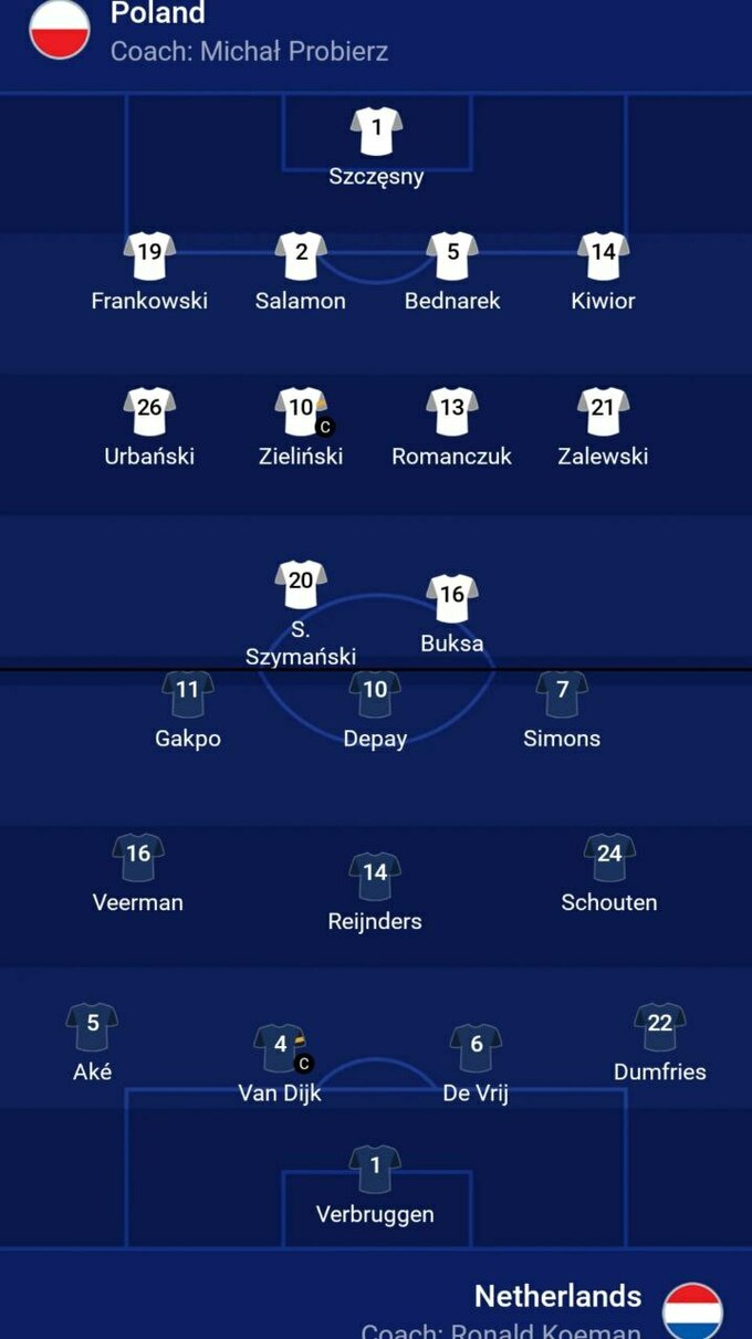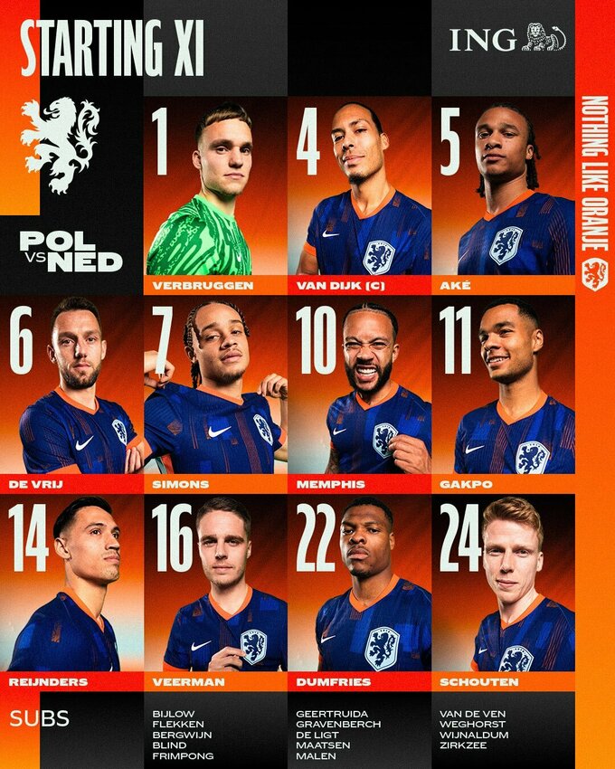 Нидерланды: Вербрюгген, Думфрис, де Врей, ван Дейк, Аке, Схаутен, Рейндерс, Верман, Симонс, Гакпо, Депай.