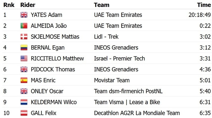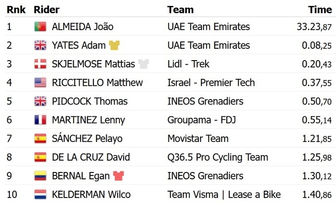Заключительный этап, горную гонку с раздельным стартом на 15,7 км выиграл его партнер по команде, португалец Жоау Алмейда, который финишировал вторым в общем зачете с отставанием всего в 22 секунды.
