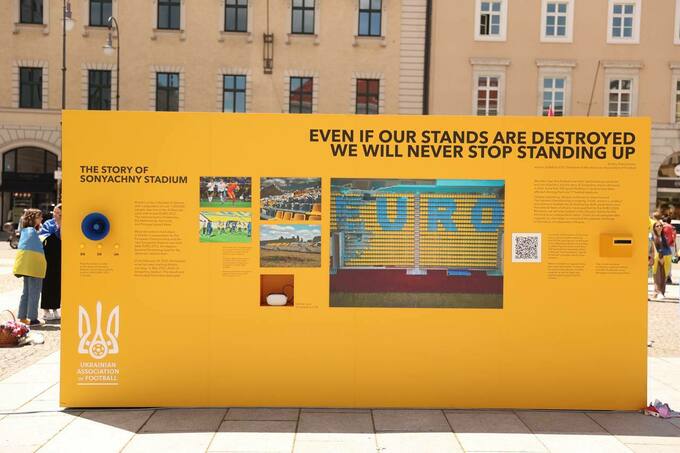 Украинская ассоциация футбола провезла трибуну через всю Европу, чтобы она свидетельствовала перед миром – футбол не вне войны. Ведь более 500 спортивных объектов пострадали от бомбардировок и ракетных ударов россии.
