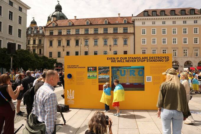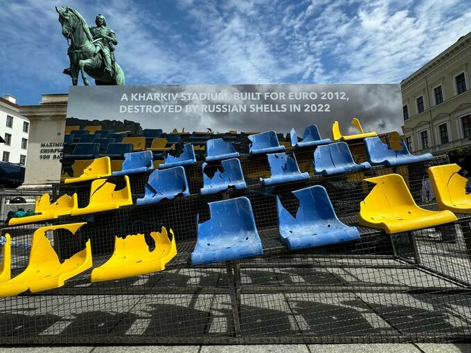 В центр Мюнхена привезли трибуну харьковского стадиона «Солнечный». Он был построен Украиной к Евро-2012 и разрушен русскими войсками в мае 2022 года.