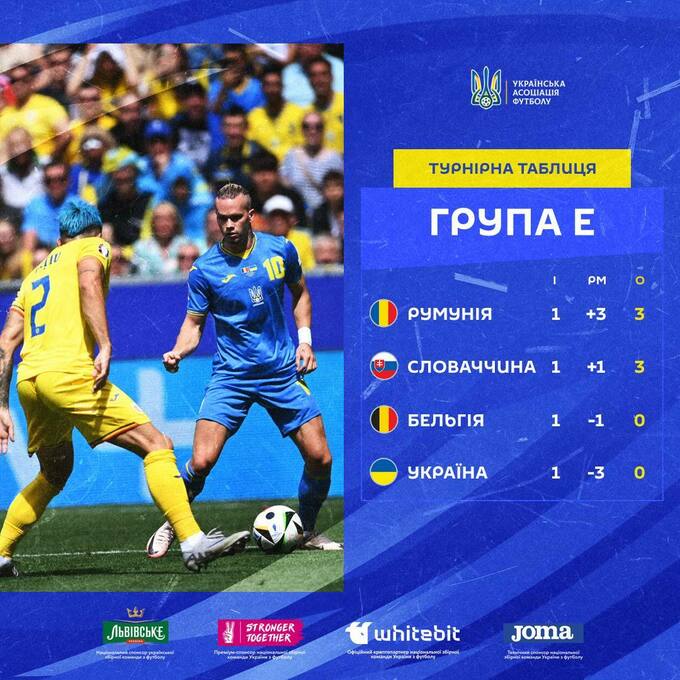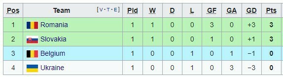 Украина занимает 4-е место в группе E после 1-го тура. Лидируют Румыния и Словакия (по 3 очка). Бельгия и Украина идут без набранных пунктов.