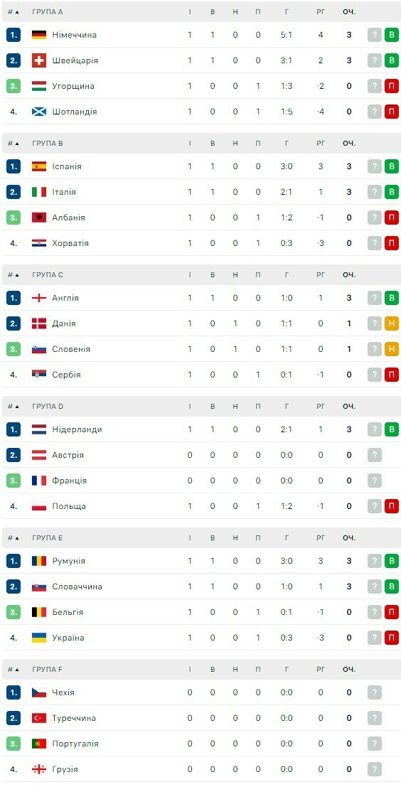 Турнирные таблицы Евро-2024. Украина занимает 4-е место после 1-го тура
