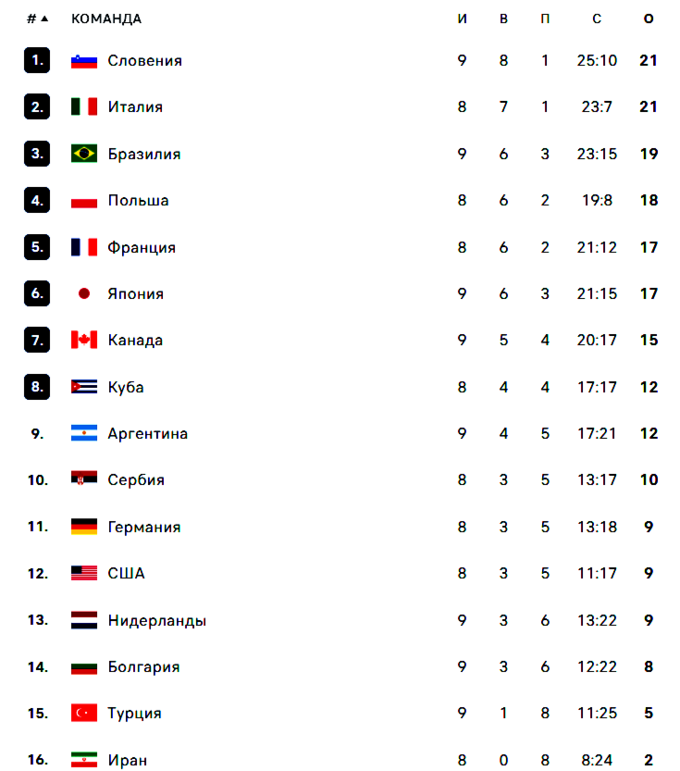 Сборная Бразилии во вторник нанесла поражение Нидерландам 3:1 и подтянулась к лидерам Италии и Словении в общей турнирной таблице. Очень важную победу одержали волейболисты Канады, которые на тай-брейке сломили сопротивление Японии 3:2. Еще в двух матчах Болгария обыграла Турцию 3:1, а Словения оказалась сильнее Аргентины 3:0.