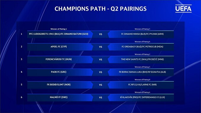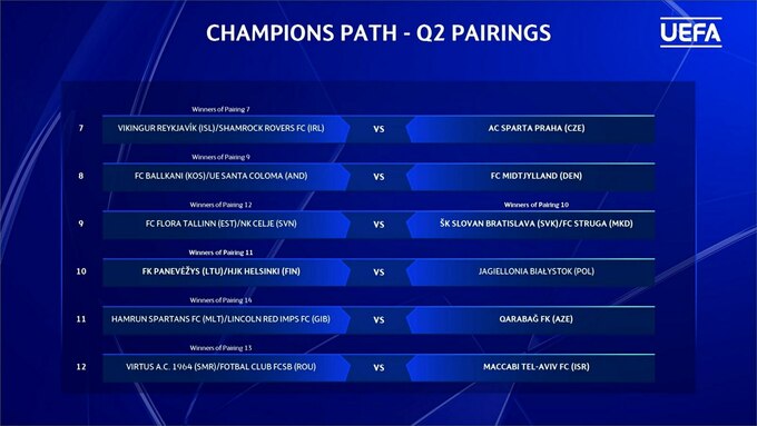 Победители пар выйдут в Q3 Лиги чемпионов, а проигравшие перейдут в Q3 Лиги Европы.