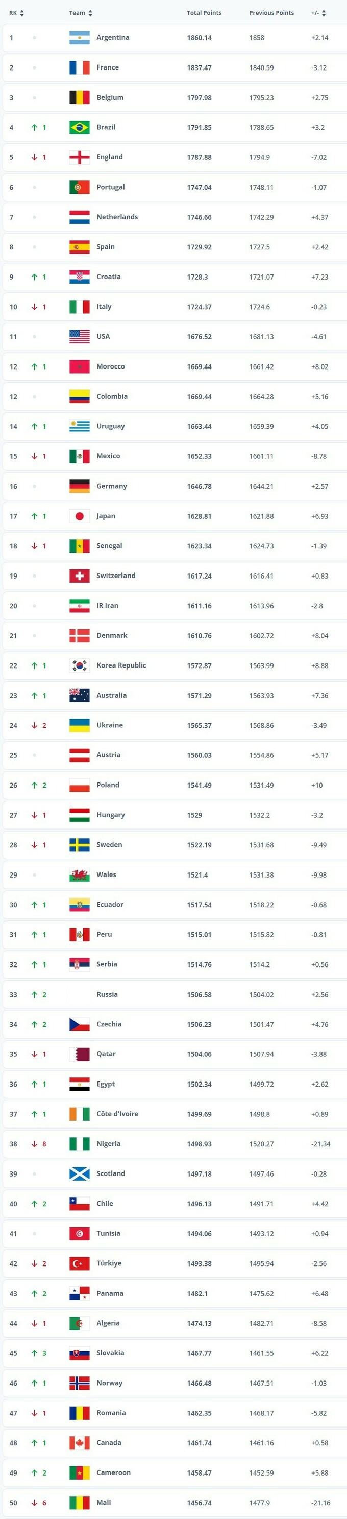 В топ-5 рейтинга ФИФА входят Аргентина, Франция, Бельгия, Бразилия и Англия. С полным рейтингом можно ознакомиться по ссылке.