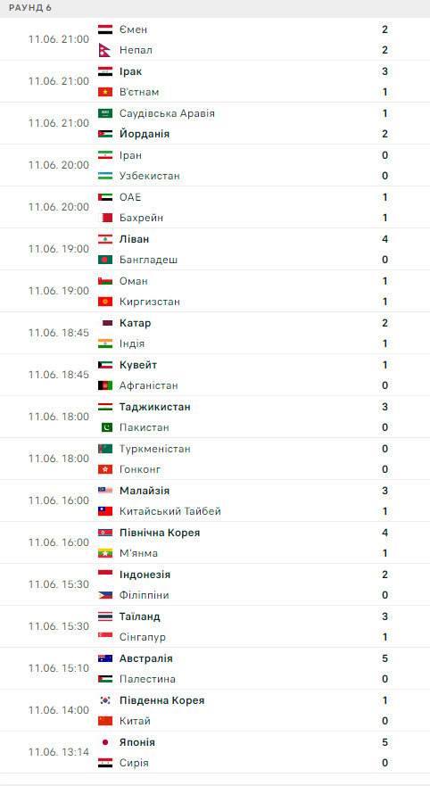Состоялись матчи последнего 6-го тура отбора к чемпионату мира 2026 в азиатской зоне.