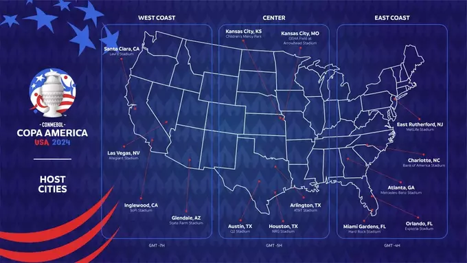 Турнир пройдет на 14 стадионах десяти американских штатов. Финал запланирован 14 июля на «Хард Рок Стедиум» в Майями.