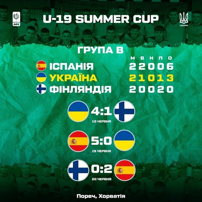 Участие в соревнованиях принимают 9 команд, которые сначала были разбиты на три трио. В группе В сборная Украины обыграла Финляндию (4:1) и уступила Испанию (0:5). В очном противостоянии испанцы обыграли финнов (2:0), так что сине-желтые финишировали вторыми.
