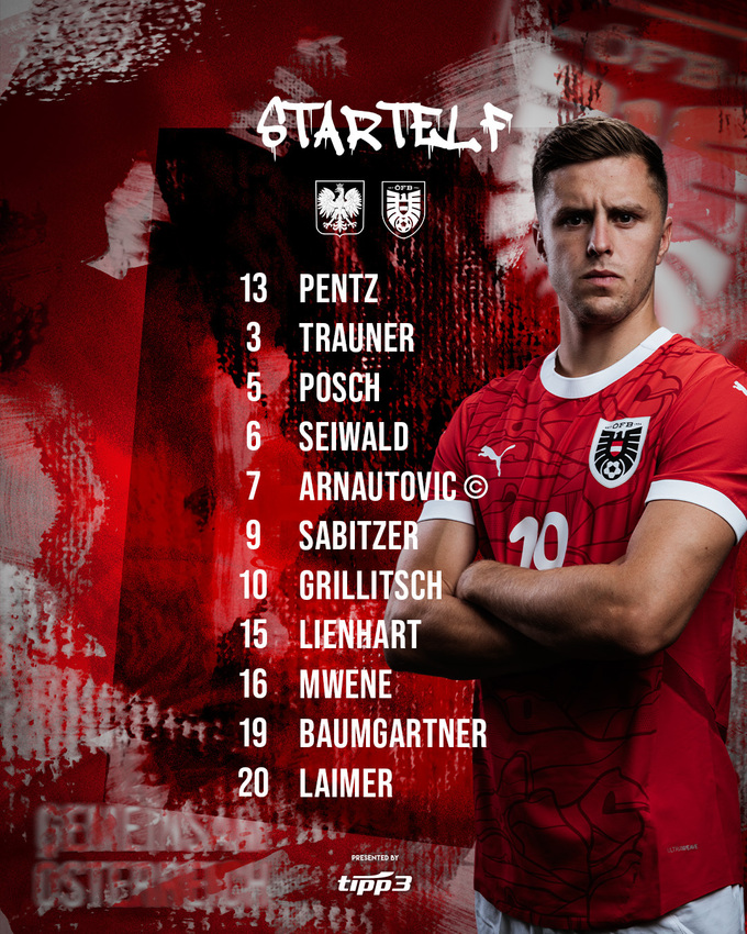 Австрия: Пентц, Тройнер, Пош, Зайвальд, Баумгартнер, Ляймер, Линхарт, Мвене, Гриллиш, Забитцер, Арнаутович