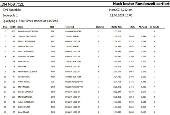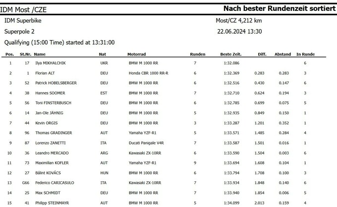 Своего главного конкурента Флориана Альта на Хонде, который стал вторым, Михальчик опередил на 0.283 секунды. Этот поул стал для украинца вторым подряд в нынешнем сезоне. Замкнул первый стартовый ряд Патрик Хобельсбергер также на BMW, но команды Gert56.