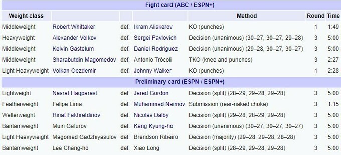 В главном бою встретились: Роберт Уиттакер (Австралия, 25–7) – Икрам Алискеров (страна-террорист, 15–1)