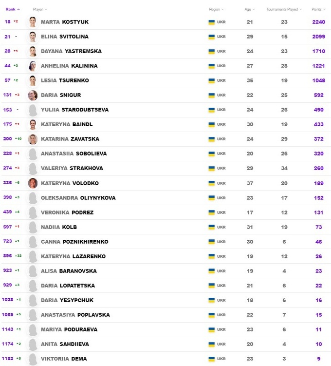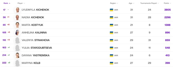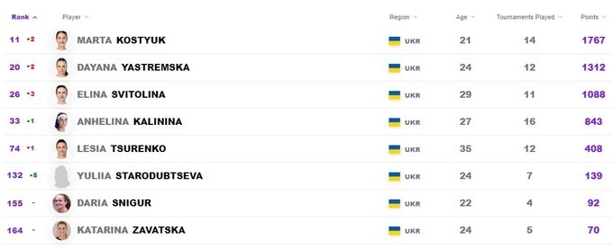 Марта Костюк потеряла 2 позиции, Дарья Снигур – три, Даяна Ястремская, Катерина Байндл и Анастасия Соболева – одну. Элина Свитолина осталась на 21-м месте, Ангелина Калинина и Леся Цуренко поднялись на несколько строчек