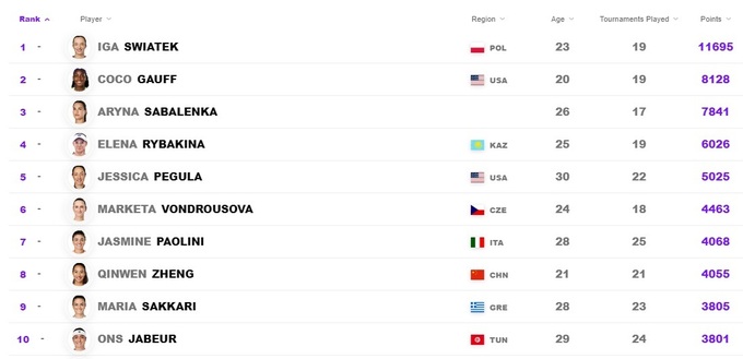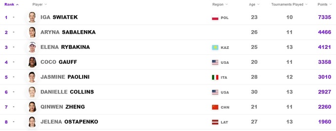 В топ-8 без изменений, но Калинская уже 9-я, Азаренко – 10-я, они опередили Марту Костюк. Пегула поднялась на 15-ю позицию.