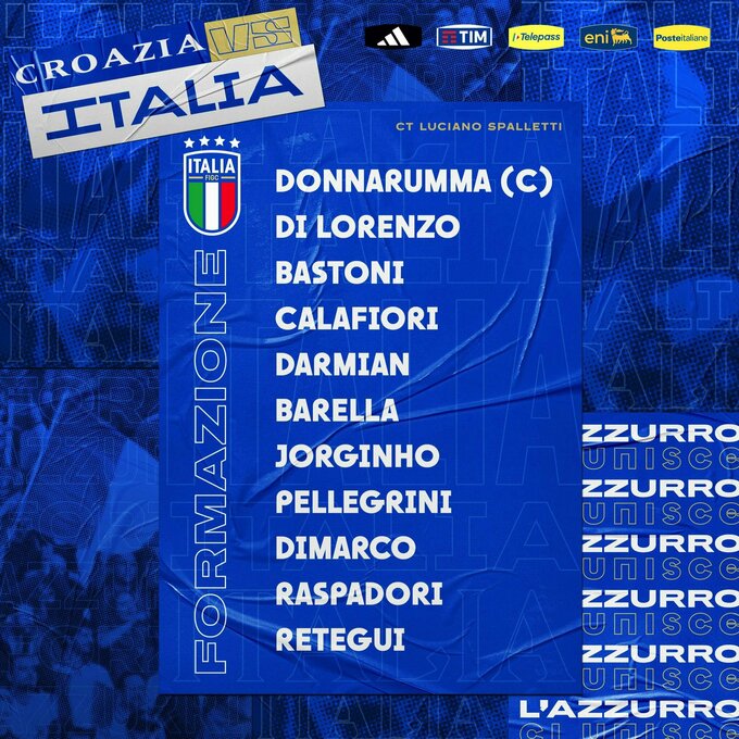 Италия: Доннарумма, Ди Лоренцо, Бастони, Калафьори, Дармиан, Жоржиньо, Барелла, Распадори, Димарко, Пеллегрини, Ретеги