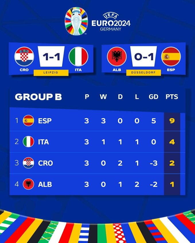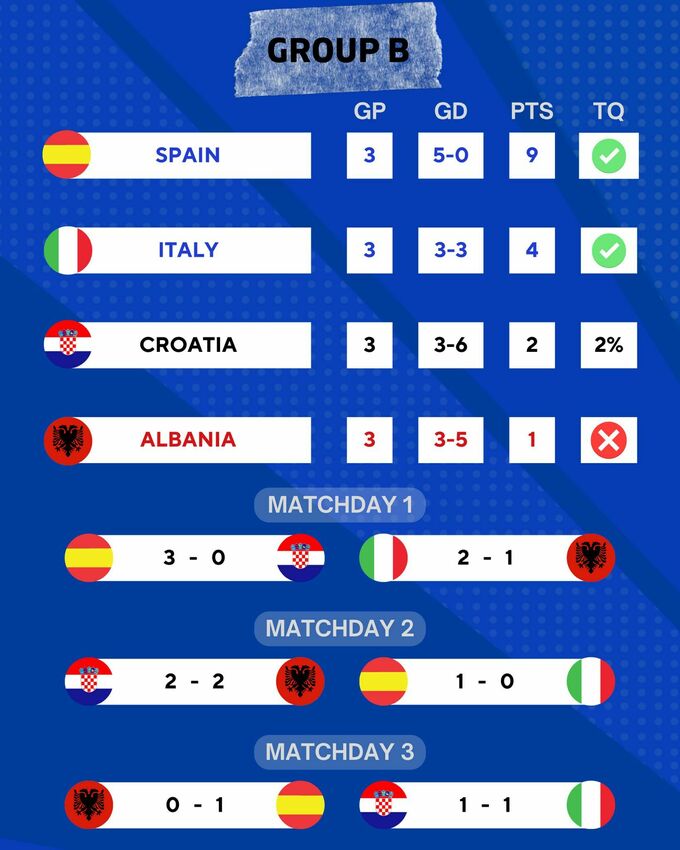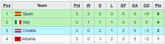 Итоговое положение в группе B: Испания – 9 очков, Италия – 4, Хорватия – 2, Албания – 1.