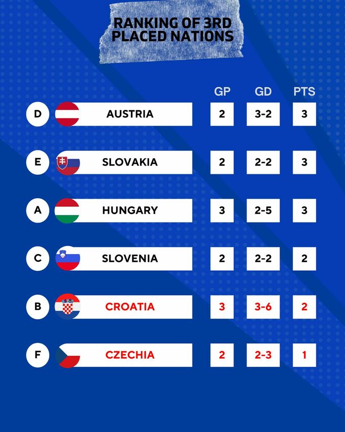 Хорватам нужно, чтобы Чехия и Грузия проиграли свои матчи 3-го тура в группе F, а также, чтобы в группе C у третьего места получилась разница мячей хуже, чем 3–6, например, чтобы Словения потерпела разгромное поражение от Англии в три мяча и более.